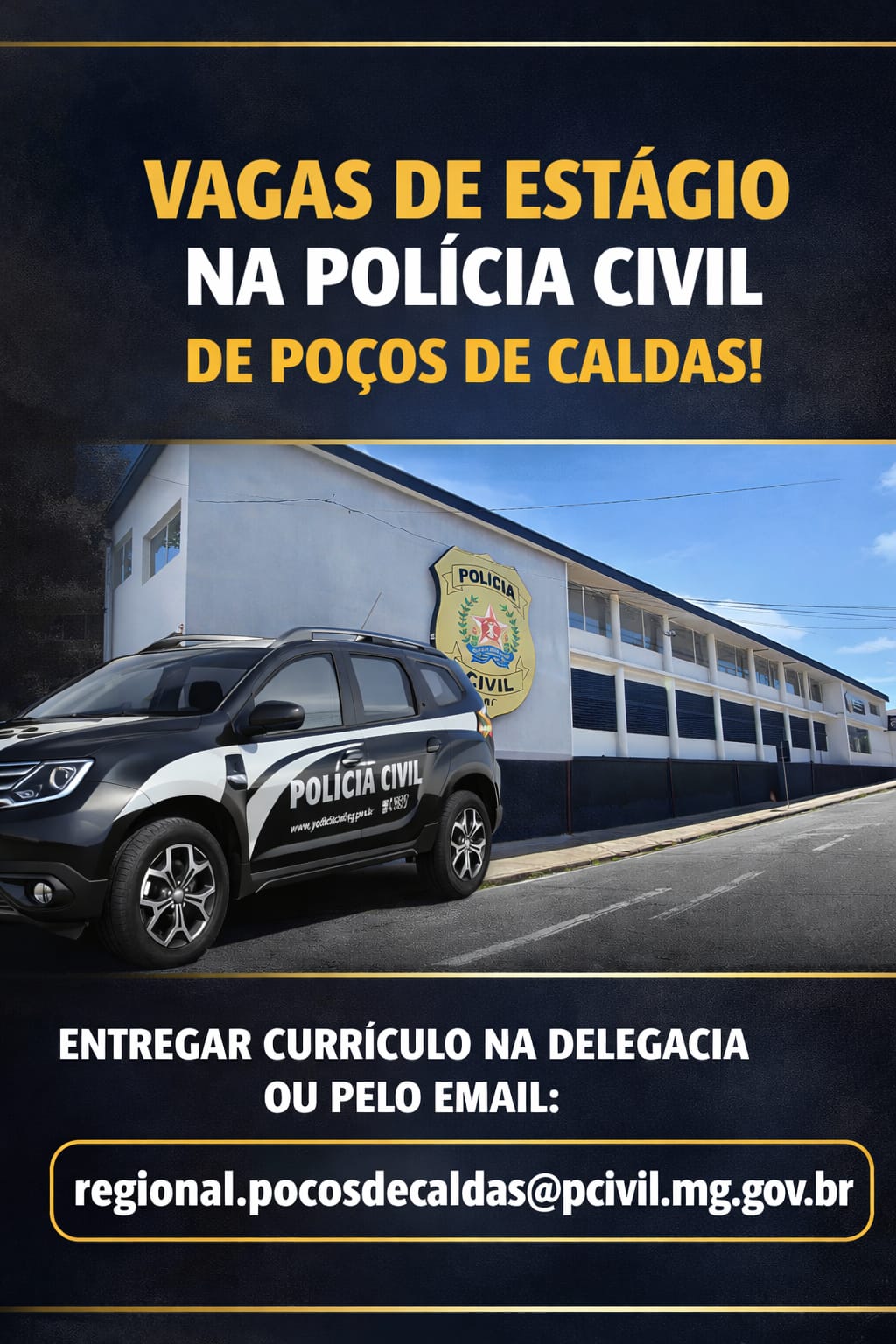 A Delegacia Regional da Polícia Civil de Poços de Caldas informa a abertura de processo seletivo para estágio remunerado, destinado a estudantes regularmente matriculados no curso de Direito.